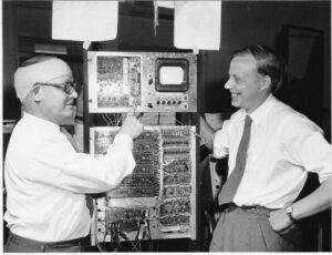 Turning now to the other person in the photograph, Fred Goulding, the PDPRs reveal that he joined AECL May 12, 1952, shortly after it was incorporated, succeeded Hardwick as Head of Electronics Branch in 1957 and “Terminated Aug 18, 1961 to take an appointment with Lawrence Radiation Laboratory.” The Goulding family lived initially at 30 Wolfe and later at 35 Faraday. No details have been unearthed about the family, but Fred went on to enjoy an outstanding career at the Lawrence Radiation Laboratory.