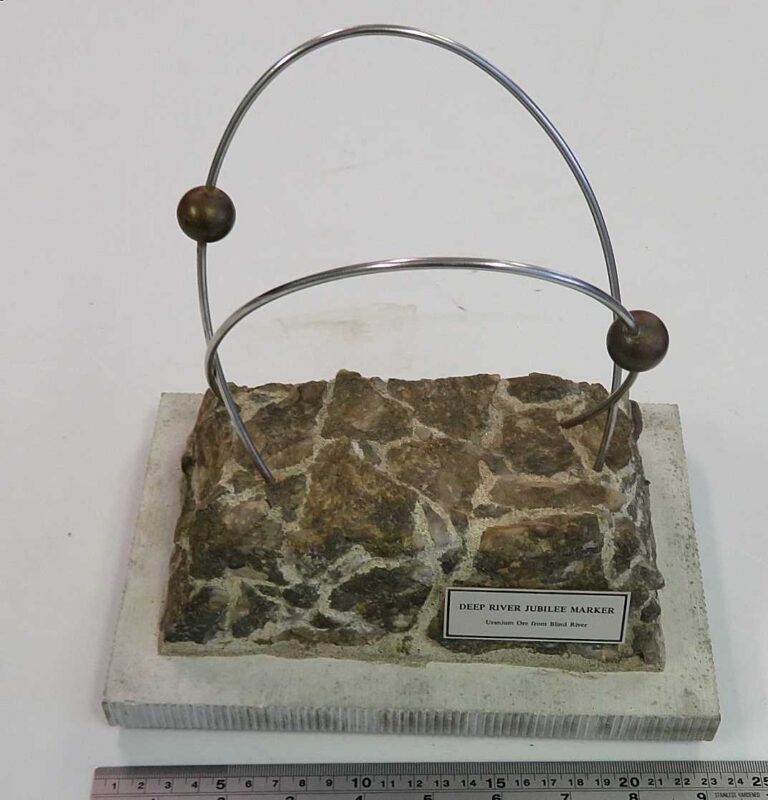 ![]() | Lamp based on 19 element CANDU fuel bundle | retirement memento; nuclear fuels | 1971- based on stamped number on fuel endplate. | 2023-006 | A desk lamp based on a 19-element CANDU fuel bundle. The fuel bundle section measures 16.5 cm in length, which corresponds to 1/3 the length of a regular fuel bundle, and has a filler, presumed to be loose sand, to simulate the weight of a uranium-loaded bundle. This type of bundle was used at the NPD and Douglas Point reactors. A date of 1971 is stamped on one of the endplates. Items of this type were often used as retirement gifts for employees. |