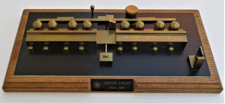 ![]() | ZEEP model as retirement memento | zeep; natural uranium reactor; research reactor | n/a | 2018-042 | An aluminum model of the ZEEP reactor presented to R. Green on his retirement to recognize his 22 years at CRNL – many of which involved work with ZEEP. The model, which stands 21 cm and sits above a 42 cm wide wooden base is largely machined out of aluminum and features movable “shielding” and a transparent glass “reactor calandria” where the fuel rods can be seen hanging in a manner very similar to the actual ZEEP arrangement. Two tanks to the left of the vessel represent the supply of heavy-water which can be pumped into the tank via glass tubing. When originally built a pump that could move “consumable celebratory liquid” was installed and could operate with the small-push button seen near the front on the right-hand side of the wooden base. |