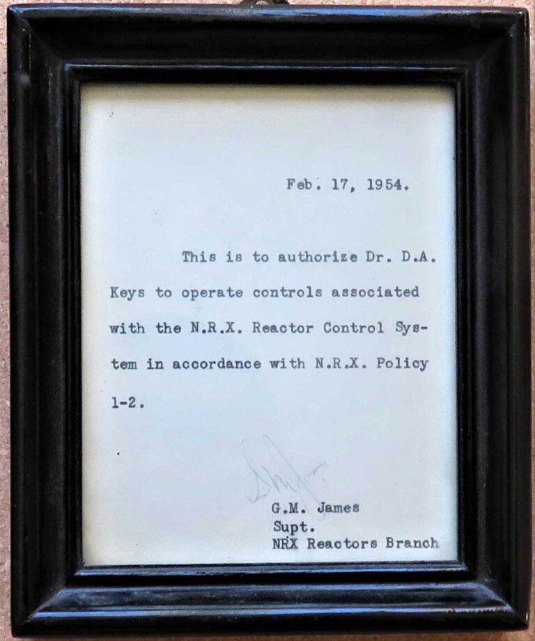 ![]() | Framed authorization for Dr. Keys to perform restart of NRX in 1954 | canada nrx research reactor; radioisotope generator; fission products | 1954 | 2023-003 | A 10 cm by 13 cm, wooden framed document dated Feb. 17, 1954, authorizing Dr. D.A. Keys “To operate controls associated with the N.R.X. Control System in accordance with N.R.X. Policy 1-2”. The authorization was given, and is signed, by G. (Gib) M. James, Superintendent of the NRX Reactors Branch. This was a historic event in that it allowed Dr. Keys to initiate the restart procedure of NRX after the serious accident of December 1952. |