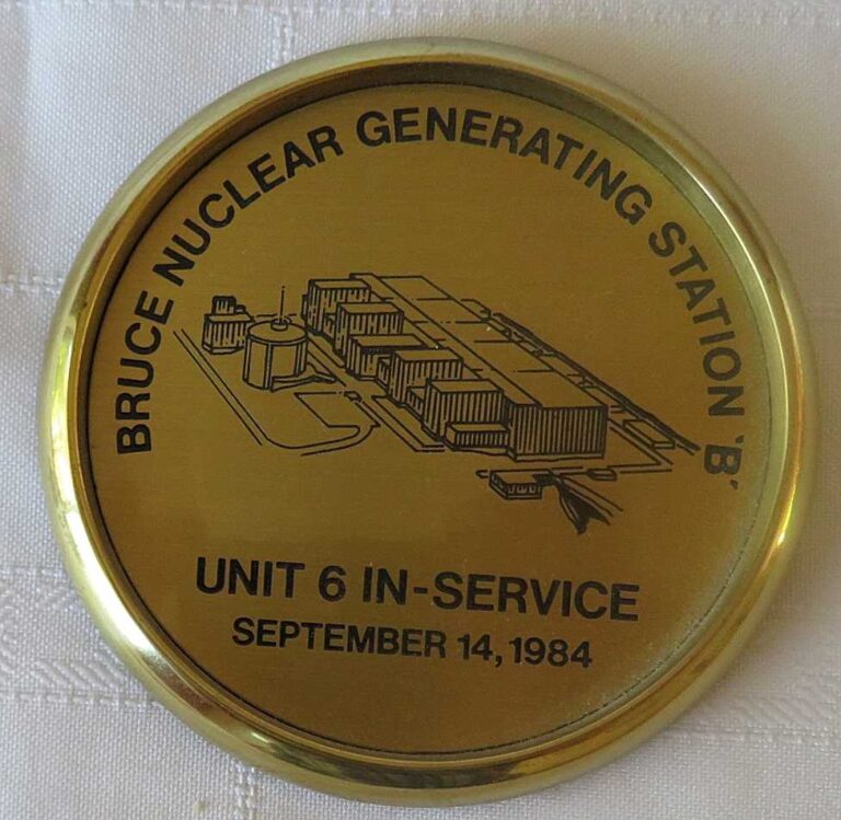 ![]() | Bruce B, Unit 6 in-service commemorative coaster | power reactor; natural uranium reactor; bruce-6 reactor | 1984 | 2018-058 | A 9.0 cm diameter brass coaster for beverage mugs issued to employees on the occasion of Unit 6 of the Bruce Nuclear Generating Station “B” being declared “In-Service”. The occasion was 1984 September 14. |