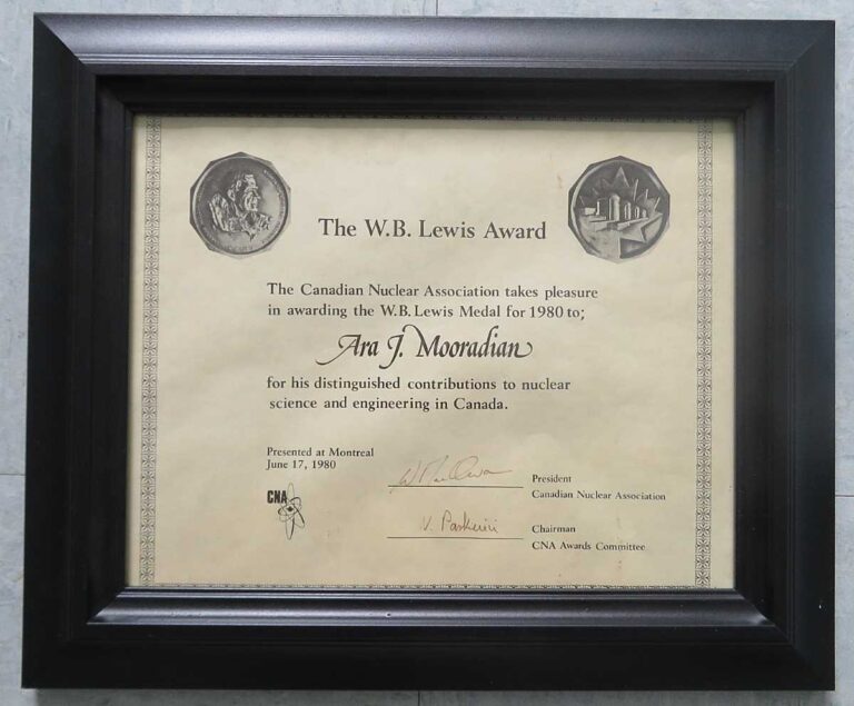 ![]() | Framed copy of WB Lewis award to AJ Mooradian | award; pioneers | 1980 | 2018-086 | A 46 cm by 37 cm framed copy of the certificate presented to Ari J. Mooradian in 1980 in recognition of his being awarded the W.B. Lewis Award “in recognition for his distinguished contributions to nuclear science and engineering in Canada.” The award was presented in Montreal on June 17, 1980, by the Canadian Nuclear Association. |