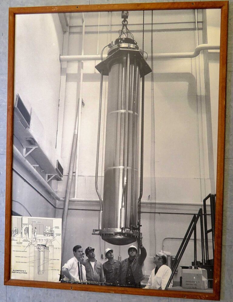 ![]() | NPD display board | power reactor; natural uranium reactor; npd reactor | ~1970 | 2018-005 | A large (53 cm by 122 cm) mounted, multi-material. display panel showing a cutaway of the NPD reactor and of the overall flow chart framed with an aluminum frame. This board is believed to have been used at the Public Information Center at Darlington G.S. and was retrieved during renovations of the Center by Julian Bayley. Julian had been one of the early Operators at NPD and completed his Ontario Hydro career as an Operator at Darlington G.S. The lower photo shows a name tag (possibly from an office door) that was attached to the display board when it was donated to the Society. |