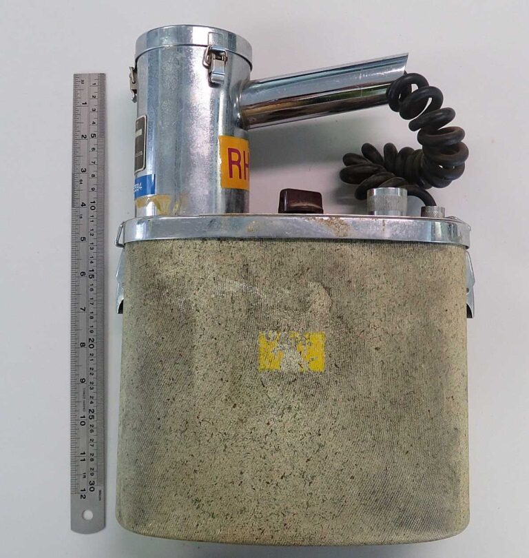 ![]() | Ludlum Model 43-5 alpha scintillation detector | radiation detectors; alpha dosimeter; scintillation counter | ~1980 | 2020-025 | A Ludlum, Model 43-5, alpha-survey detector using a zinc-sulphide scintillation crystal doped with silver as the main detector. The crystal is coupled to a 3.8 cm diameter (nominal 1.5 inch) magnetically-shielded photomultiplier tube. The probe has an overall length of 37 cm and the probe has an active area of 76 square cm. The detector window is made of aluminized polyester which is opaque to light, yet thin enough to admit alpha particles. This instrument was used by the Radiation and Industrial Safety (RIS) group at Chalk River. |