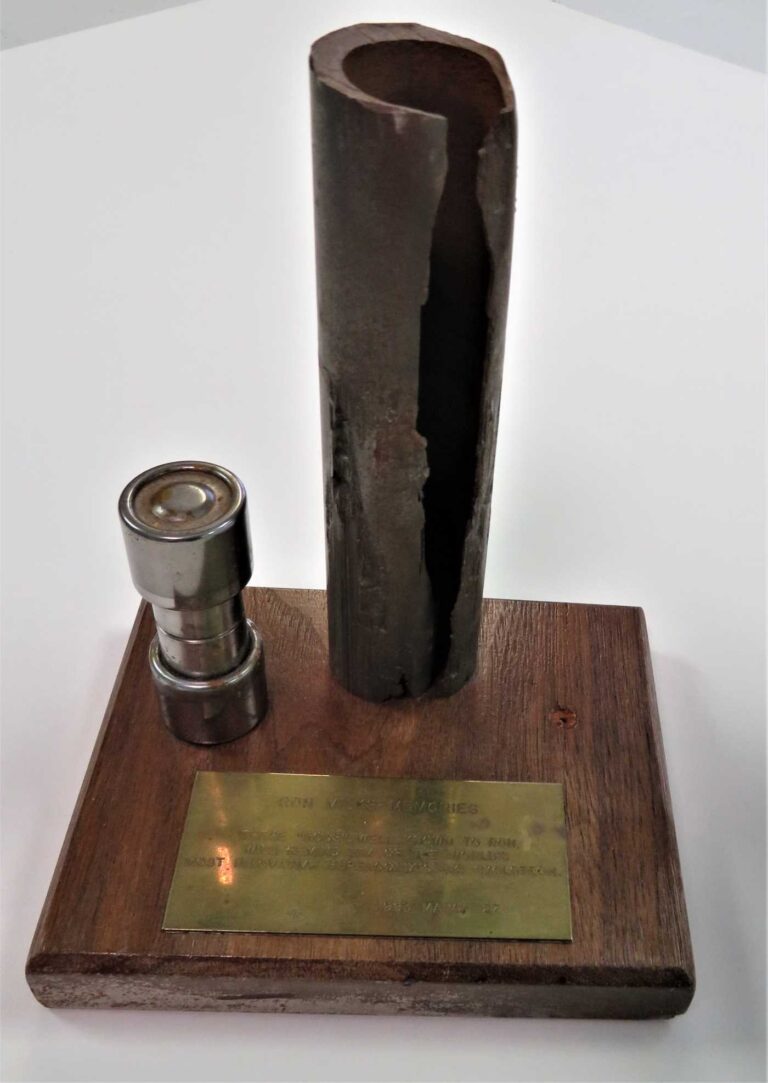 ![]() | A CANDU pressure-tube based retirement gift for Windsor Evans | retirement memento; pressure tube | 1988 | 2023-022 | A 10 cm long section of 10.3 cm inner diameter CANDU pressure tube mounted on a 16 cm by 18 cm wooden base. This artifact was made as a retirement present for Windsor Evans. In addition to the “Flying-A” logo, the engraved inscription reads “Windsor Evans, Head, Metallurgical Engineering Branch, 1967-1988”. The pressure-tube segment is autographed by many of Windsor’s work colleagues at Chalk River. |