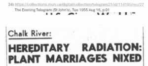 The nuclear-related story that caught my eye was one carried by the St. John’s Evening Telegram on Aug 16, 1955. The headline read “Chalk River: Hereditary Radiation: Plant Marriages Nixed”. The story, generated at Geneva Park, ON (site of the Couchiching Conferences) cites a talk on the effects of radiation on genes by Dr. E.W.R. Steacie, president of the National Research Council.
