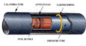 In a CANDU reactor each fuel channel consists of two major components. One of these is a thick-walled zirconium-alloy pressure tube that contains the fuel bundles (12 or 13 within each channel) and through which the hot and pressurized heavy water flows. The pressure tube is nested within a thin-walled calandria tube, outside of which lies the cooler moderator water. A dry gas(carbon dioxide)) in the annulus between the two long tubes is monitored for the presence of water, which would indicate a leak from either of the tubes. Over time the pressure tubes sag due to long-term creep under the weight of the fuel bundles, each weighing ~ 24 kg. To ensure the sagging does not allow the hot pressure tube to contact the cool calandria tube, at PNGS two coiled “garter” springs were strategically placed in the gap to maintain the spacing between the tubes.